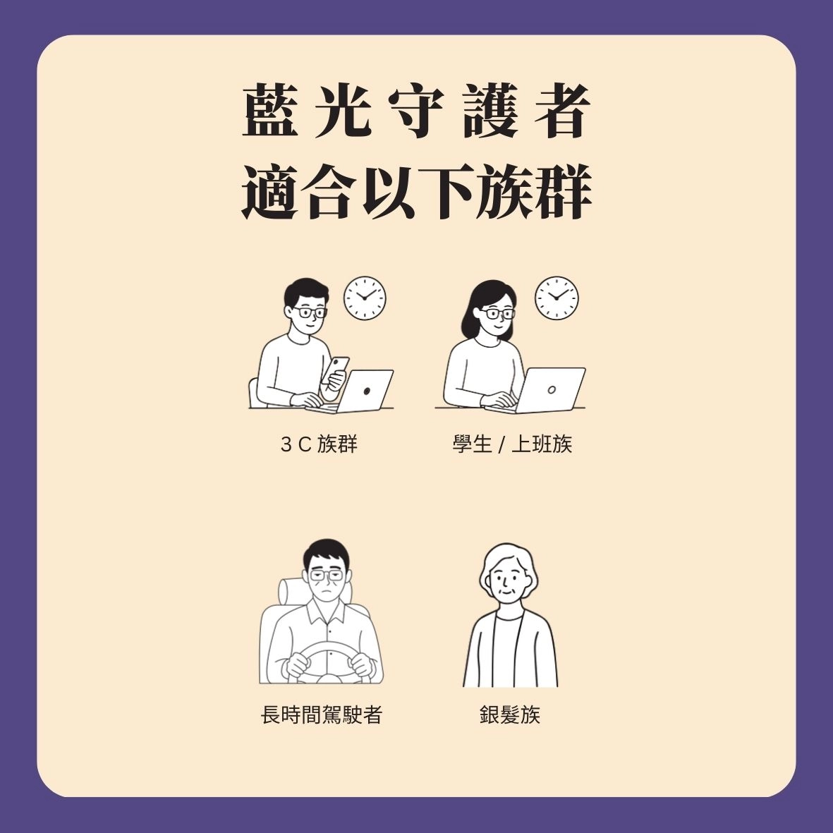 - 3C 產品重度使用者: 每日使用螢幕超過 8 小時的上班族或學生。