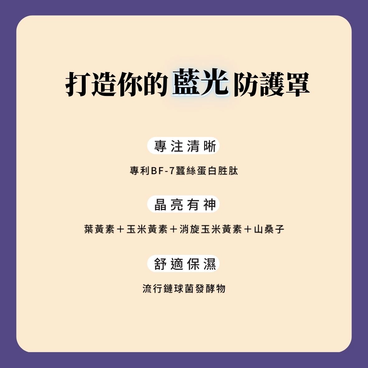 強大的抗氧化保護,能協助調節焦距,放鬆緊繃的雙眼肌肉,對於緩解疲勞感有顯著成效。