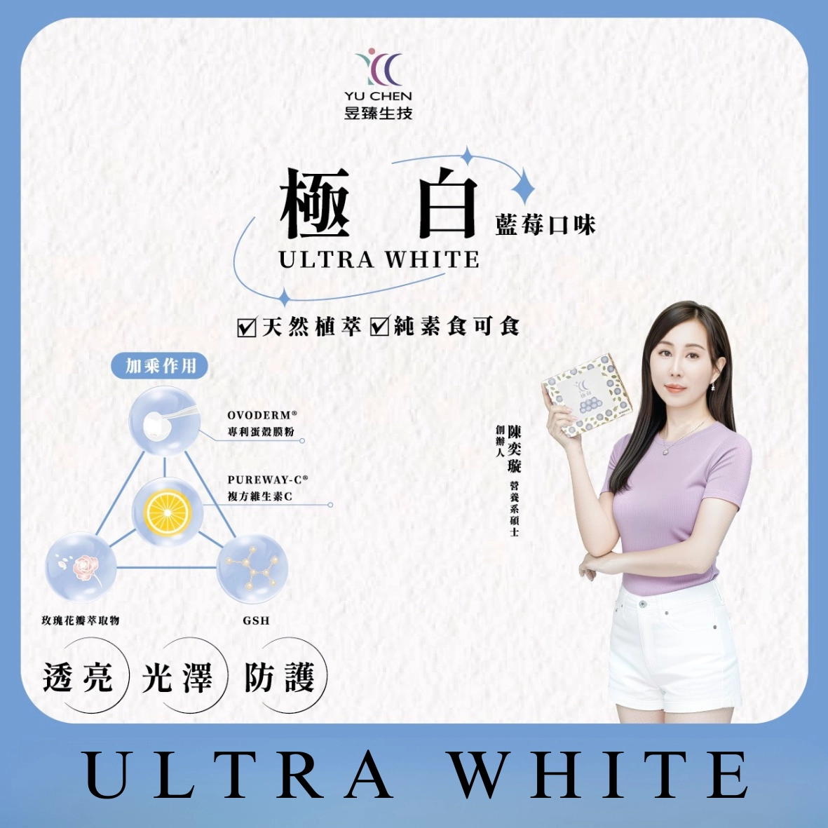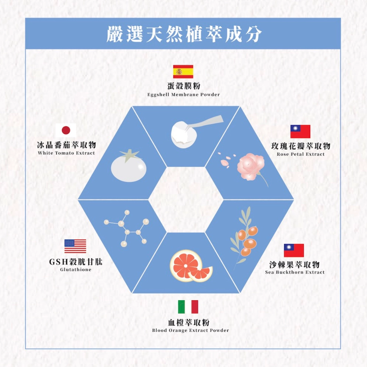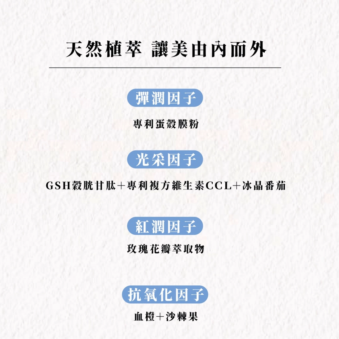 採用高純度專利穀胱甘肽,能有效協調體內生理機能,幫助由內而外散發亮點,是公認的透亮關鍵成分。
