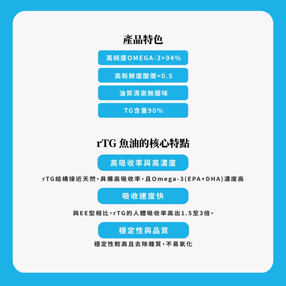 採用最先進的 rTG (re-esterified Triglycerides) 加工技術,不僅去除了多餘雜質,更比一般型態魚油提升多倍吸收效率,讓每一滴精華都能被身體充分利用。
